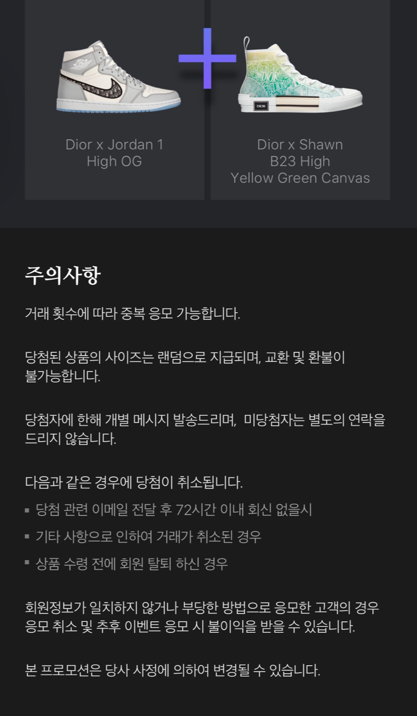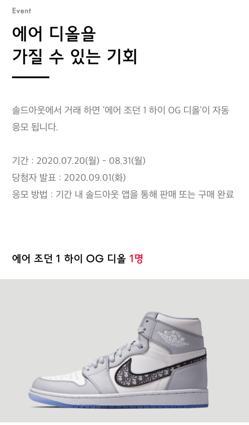 1. 디올 조던 이벤트는 지난 주 20일부터 솔드아웃에서 먼저 시작했다. 그리고 오늘 크림이 이벤트를 8월 1일부터한다는 공지를 하고 다시 오후에 28일부터로 바꿨다. 결국, 이벤트 기간과 상품은 크게 다르지 않다.(물론 크림이 디올 스니커즈를 추가로 주긴하나 메인은 '디올 조던1 하이'이다.)