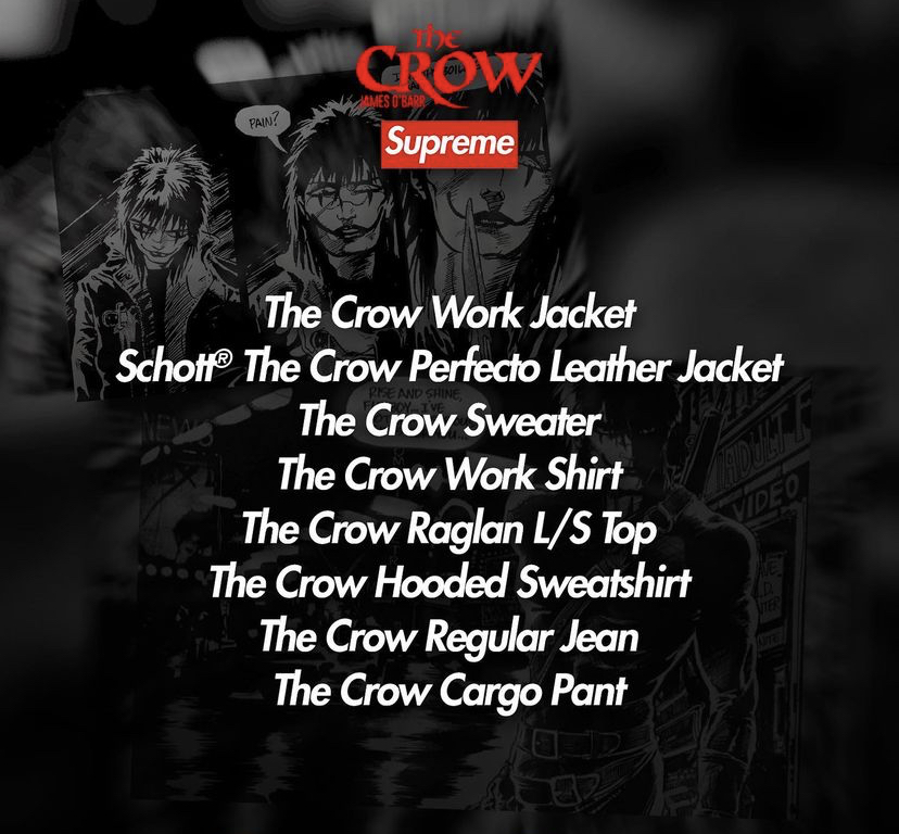 돌아오는 9/16 목요일 슈프림(Supreme) 4주차 발매에 더 크로우(The Crow) 콜라보 제품이 드랍될 예정이라는 정보다.