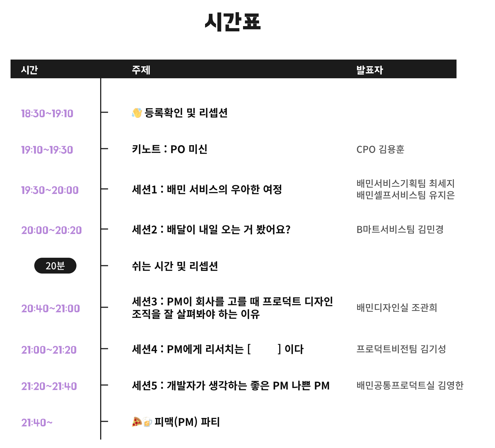 - 세션2: 배민 서비스의 우아한 여정 -B2C와 B2B영역을 맡고 있는 PM분들의 발표, 플랫폼의 특성상 다양한 이해관계자들이 얽혀있기 때문에 각 사이드에서 일을 할 때 어떻게 다른지 어떤 부분을 주요하게 생각하는지를 공유해줬다. 실제로 나도 B2C가 아닌 B2B PM이기 때문에 해당 발표에 많이 공감했다.