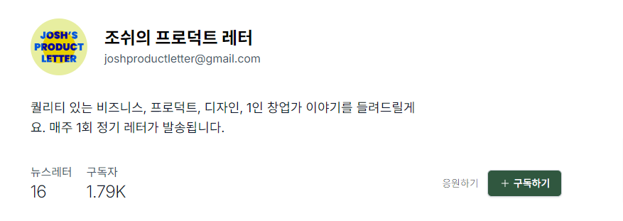 어, 음.. 글을 마쳐야하는데 오랜만의 글을 작성하고 맺음말을 쓰려니 정리가 덜 된 기분이지만 이제 마무리하면서, 조쉬의 프로덕트 레터는 이 시대를 살아가는 직장인들 중 사업에 조금이라도 관심있지만 사업이라는 단어가 너무 크게 느껴져서 겁이나는 사람이라면 사업에 대한 진입장벽을 낮추고 나도 뭔가 해볼까 생각할 수 있게 도움이 되는 일종의 동기부여 뉴스레터라고 생각한다.